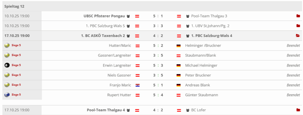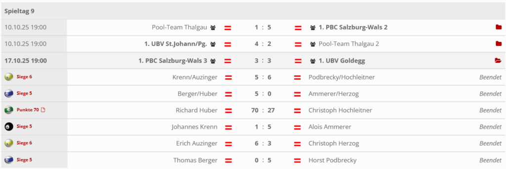 Damit bleibt die dritte Mannschaft des 1. PBC Salzburg-Wals vorerst auf dem vorletzten Tabellenplatz, hat beim Ligafinale am 22. November jedoch noch alle Chancen selbst in der Hand. Unterstützung könnte zusätzlich von der zweiten Mannschaft des Vereins kommen, die im Medaillenkampf ebenfalls auf die Mannschaft aus Goldegg trifft.