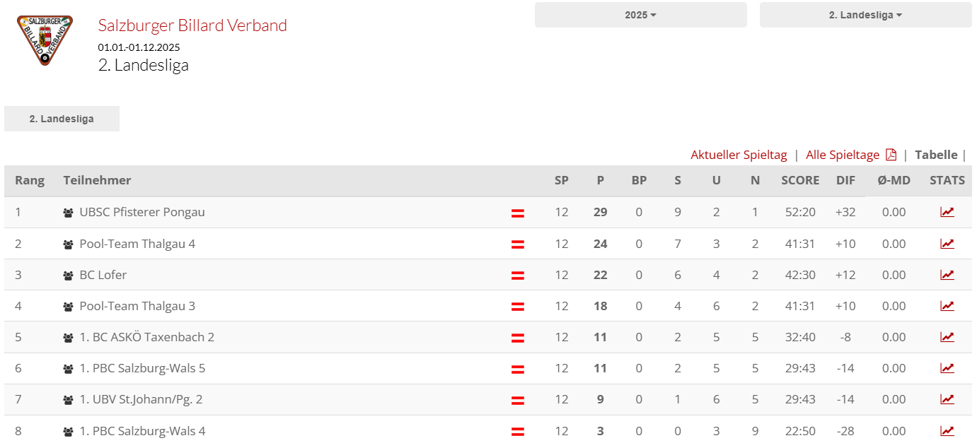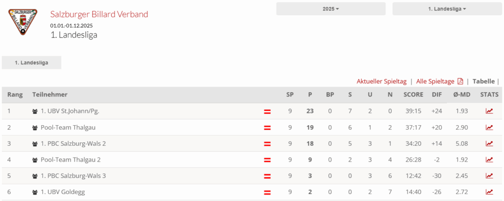 Am Freitag wurde das letzte noch ausstehende Spiel der vorletzten Runde in der 1. SBV Landesliga ausgetragen. Die dritte Mannschaft des 1. PBC Salzburg-Wals empfing dabei das Team des 1. UBV Goldegg. Die Begegnung hatte große Bedeutung, da die Goldegger direkte Konkurrenten im Kampf gegen den Abstieg sind. Diese Brisanz war auch am Tisch deutlich spürbar: Alle drei Spielabschnitte verliefen ausgeglichen, sodass das Ergebnis – ein gerechtes Unentschieden – letztlich niemanden überraschte. Man könnte sagen: ein klassisches Abstiegsduell.
