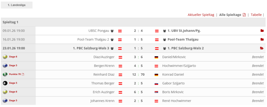 Mit einwöchiger Verspätung am 23.1., wurde in der 1. Landesliga das Aufeinandertreffen der dritten und zweiten Mannschaft im Kugelrund ausgetragen. Der Titelaspirant der zweiten Mannschaft ließ in dieser Begegnung nichts dem Zufall überlassen und entschied die Partie frühzeitig für sich, nachdem sowohl beide Doppelpartien als auch die darauffolgenden drei Einzelpartien gewonnen wurden. Ergebniskosmetik gelang der dritten Mannschaft lediglich in der Disziplin 9-Ball, in der der Ehrenpunkt zum 1:5-Endstand erzielt werden konnte.